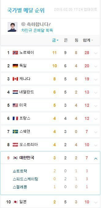 김정환은 2012년 런던 대회 단체전 금메달, 2016년 리우데자네이루 개인전 동메달에 이어 올림픽 3회 연속 메달을 따냈다 올림픽 메달 순위. 쿠키뉴스 김찬홍 기자 = 금메달 7개 이상을 획득해 메달 순위 10위 안에 든다는 목표를 세운 한국 선수단이 첫날 아쉬운 성적을 냈다.